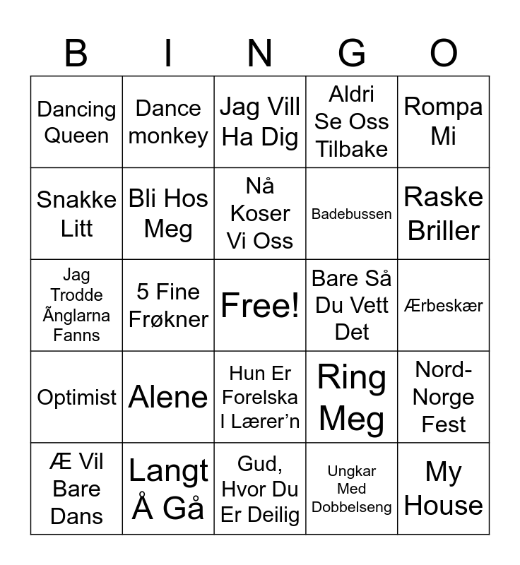 This bingo card has a free space and 29 words: Æ Vil Bare Dans, Fredag, 5 Fine Frøkner, Salmalaks, Dancing Queen, Jag Vill Ha Dig, Bli Hos Meg, Alene, Bare Så Du Vett Det, Langt Å Gå, Ærbeskær, My House, Gud, Hvor Du Er Deilig, Ungkar Med Dobbelseng, Raske Briller, Idyll, Hun Er Forelska I Lærer’n, Optimist, Rompa Mi, Jag Trodde Ãnglarna Fanns, Ring Meg, Fy Faen, Badebussen, Snakke Litt, Aldri Se Oss Tilbake, Dance monkey, Nord-Norge Fest, Nå Koser Vi Oss and Friday Fahrenheit.