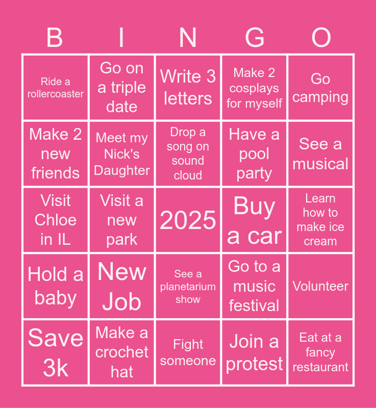 This bingo card has a free space and 24 words: New Job, Make a crochet hat, Drop a song on sound cloud, Save 3k, Go camping, Ride a rollercoaster, Make 2 new friends, Go on a triple date, Buy a car, See a planetarium show, Have a pool party, Visit Chloe in IL, Go to a music festival, Volunteer, Meet my Nick's Daughter, Join a protest, Learn how to make ice cream, Write 3 letters, See a musical, Visit a new park, Eat at a fancy restaurant, Hold a baby, Make 2 cosplays for myself and Fight someone.