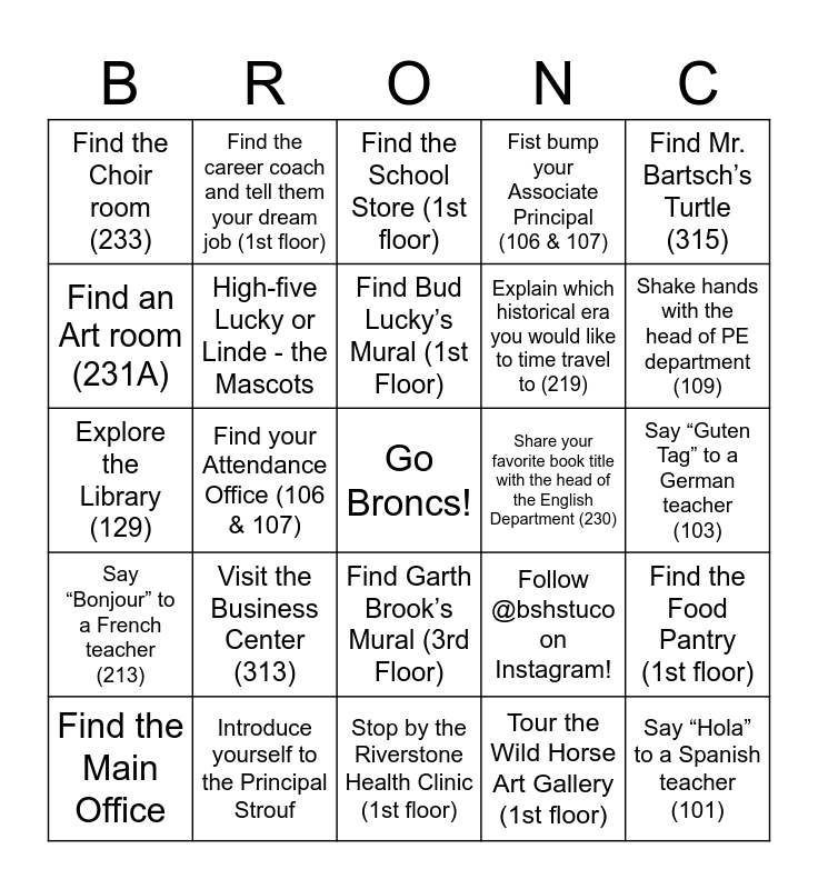 This bingo card has a free space and 40 words: Shake hands with the Math Department Chair (308), Explore the Library (129), Find the Cafeteria, High-five Lucky or Linde - the Mascots, Introduce yourself to the Principal Strouf, Find Garth Brook’s Mural (3rd Floor), Find Bud Lucky’s Mural (1st Floor), Go into the Auditorium, Find Mr. Bartsch’s Turtle (315), Say “Bonjour” to a French teacher (213), Find your Attendance Office (106 & 107), Fist bump your Associate Principal (106 & 107), Say “Hola” to a Spanish teacher (101), Say “Guten Tag” to a German teacher (103), Share your favorite book title with the head of the English Department (230), Visit the Business Center (313), Find the Band room (113), Find the Choir room (233), Get a bracelet from a Counselor (130), Find the School Store (1st floor), Find the Food Pantry (1st floor), Tour the Wild Horse Art Gallery (1st floor), Explain which historical era you would like to time travel to (219), Find an Art room (231A), Talk to a club or activity supervisor (small gym), Find a coach (small gym), Have your parents talk to Bronc Boosters (AKA PTA), Share a recipe w/ a Family and Consumer Science teacher (134), High-five the Chair of the SpEd Department (122), Pick a favorite Senior Tile (3rd floor), Visit the Courtyard (1st floor), Find the Main Office, Pick up a clubs/activities booklet in the Activities Office, Follow @bshstuco on Instagram!, Shake hands with the head of PE department (109), Stop by the Riverstone Health Clinic (1st floor), Say “Hello” to Ashley Goodluck our Indian Education Coordinator (210), Say “Hi” to Officer Boeckel (1st floor), Find the career coach and tell them your dream job (1st floor) and Fist bump Mrs.Blee (306).