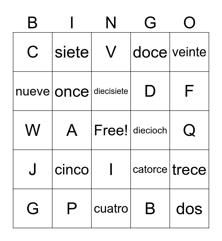 This bingo card has a free space and 46 words: uno, dos, tres, cuatro, cinco, seis, siete, ocho, nueve, diez, once, doce, trece, catorce, quince, dieciseis, diecisiete, diecioch, diecinueve, veinte, A, B, C, D, E, F, G, H, I, J, K, L, M, N, O, P, Q, R, S, T, U, V, W, X, Z and Y.