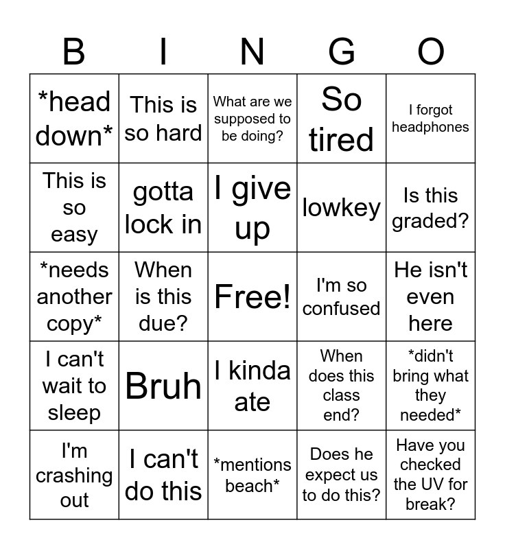 This bingo card has a free space and 24 words: Bruh, I can't do this, I give up, I'm crashing out, I forgot headphones, *head down*, This is so easy, This is so hard, I'm so confused, I kinda ate, lowkey, *needs another copy*, When does this class end?, *didn't bring what they needed*, gotta lock in, Does he expect us to do this?, He isn't even here, What are we supposed to be doing?, Is this graded?, When is this due?, Have you checked the UV for break?, I can't wait to sleep, So tired and *mentions beach*.