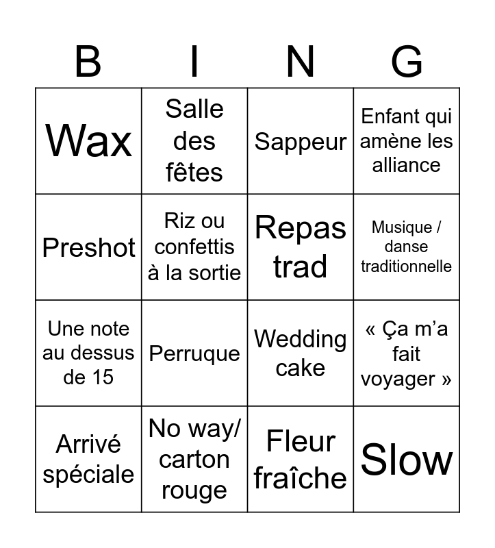 This bingo card has 16 words: No way/ carton rouge, « Ça m’a fait voyager », Sappeur, Wax, Une note au dessus de 15, Salle des fêtes, Wedding cake, Fleur fraîche, Preshot, Riz ou confettis à la sortie, Arrivé spéciale, Enfant qui amène les alliance, Perruque, Musique / danse traditionnelle, Repas trad and Slow.