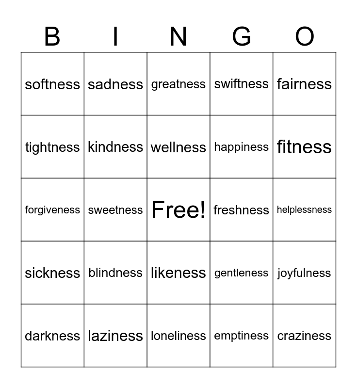 This bingo card has a free space and 29 words: darkness, madness, sweetness, weakness, softness, greatness, kindness, blindness, freshness, laziness, helplessness, craziness, loneliness, emptiness, fitness, goodness, likeness, sickness, fairness, forgiveness, gentleness, tiredness, happiness, tightness, swiftness, sadness, joyfulness, wellness and sharpness.