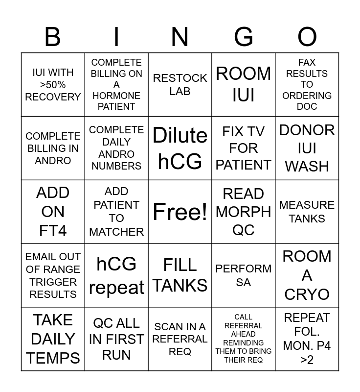 This bingo card has a free space and 42 words: Perform IUI Wash, Dilute hCG, spun pellet, hCG repeat, CALL REFERRAL AHEAD REMINDING THEM TO BRING THEIR REQ, ROOM A CRYO, REPEAT FOL. MON. P4 >2, PERFORM REFERRAL IUI, RESTOCK LAB, FILL TANKS, MEASURE TANKS, DONOR IUI WASH, ADD PATIENT TO MATCHER, FAX RESULTS TO ORDERING DOC, CHECK IN DONOR SPERM, PERFORM SA, PERFORM CRYO, ADD ON FT4, ROOM A REFERRAL PATIENT, COMPLETE BILLING ON A HORMONE PATIENT, COMPLETE BILLING IN ANDRO, DILUTE E2, DILUTE hCG, IUI WITH >50% RECOVERY, READ A MORPHOLOGY, STAIN MORPH SLIDES, FIX TV FOR PATIENT, CLEAN COLLECTION ROOM, HAND OUT REFERRAL IUI, SCAN CONSENTS IN CHART, EMAIL NURSING ASKING FOR MISSING ORDERS, EMAIL OUT OF RANGE TRIGGER RESULTS, COMPLETE DAILY ANDRO NUMBERS, SCAN IN A REFERRAL REQ, EMAIL NURSING A REQUESTED LABCORP ORDER, TAKE DAILY TEMPS, QC ALL IN FIRST RUN, READ MORPH QC, READ MOTILITY QC, ROOM A SA, ROOM IUI and ROOM CRYO.