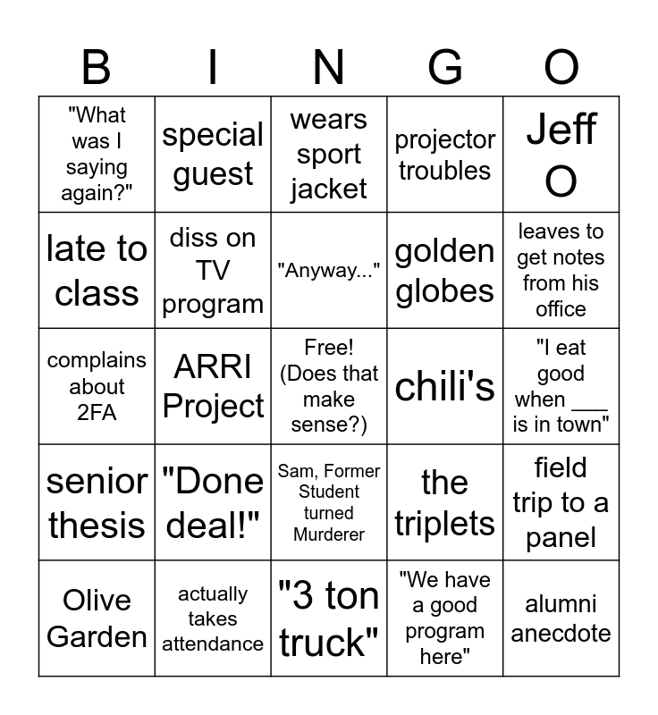 This bingo card has a free space and 27 words: the triplets, $0.50 wings, bone in, golden globes, "3 ton truck", late to class, wears sport jacket, special guest, senior thesis, chili's, field trip to a panel, complains about 2FA, projector troubles, Olive Garden, actually takes attendance, leaves to get notes from his office, "Oh, one more thing!", diss on TV program, "Anyway...", "Done deal!", "What was I saying again?", "I eat good when ___ is in town", "We have a good program here", ARRI Project, alumni anecdote, Sam, Former Student turned Murderer, Jeff O and Bill Cosby.