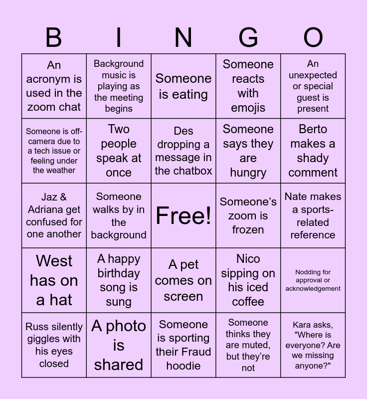 This bingo card has a free space and 50 words: "Why is it so quiet?", Kara asks, "Where is everyone? Are we missing anyone?", Someone is wearing a hat, Someone is sporting their Fraud hoodie, A happy birthday song is sung, Someone arrives late, Background music is playing as the meeting begins, Balloons are somewhere on the screen, Someone is off-camera due to a tech issue or feeling under the weather, "Next slide, please", Two people speak at once, Someone reacts with emojis, Nodding for approval or acknowledgement, Nico sipping on his iced coffee, Mike playing with Zoom video filters, Belle braiding or styling her hair, Des dropping a message in the chatbox, Someone’s zoom is frozen, A non-work-related story is told, An unexpected or special guest is present, Someone walks by in the background, Someone thinks they are muted, but they’re not, An acronym is used in the zoom chat, Someone says they are hungry, Someone is wearing green, Someone talks about food, Berto makes a shady comment, Autumn is fidgeting, Someone is eating, A pet comes on screen, Someone screen shares, BRB in the chat, Someone talks about a show they are watching, A yawn, A photo is shared, Easter is talked about, Heather’s cat says hi, Ariel’s dog is snoring, Luis is not smiling, Nate makes a sports-related reference, Danielle talks about her daughter(s), Digby is mentioned, Angela says something sassy, Jess’ eyes get wide at something, Russ silently giggles with his eyes closed, Jaz & Adriana get confused for one another, Lindsey has her hair down, Laura has a background that isn't the Golden Gate Bridge, West has on a hat and "You're muted/on mute".
