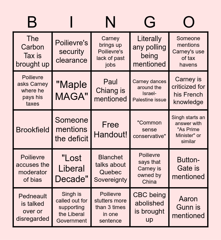 This bingo card has a free space and 24 words: "Lost Liberal Decade", Singh is called out for supporting the Liberal Government, Paul Chiang is mentioned, Pedneault is talked over or disregarded, Someone mentions Carney's use of tax havens, The Carbon Tax is brought up, Poilievre asks Carney where he pays his taxes, Poilievre's security clearance, "Common sense conservative", Blanchet talks about Quebec Sovereignty, Carney dances around the Israel-Palestine issue, Brookfield, Poilievre says that Carney is owned by China, Button-Gate is mentioned, "Maple MAGA", CBC being abolished is brought up, Singh starts an answer with "As Prime Minister" or similar, Carney brings up Poilievre's lack of past jobs, Carney is criticized for his French knowledge, Someone mentions the deficit, Aaron Gunn is mentioned, Poilievre accuses the moderator of bias, Literally any polling being mentioned and Poilievre stutters more than 3 times in one sentence.