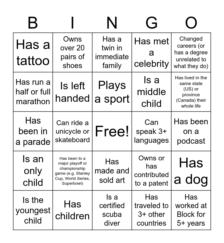 This bingo card has a free space and 61 words: Speaks a language you don't know how to speak, Has children, Can play an instrument, Is an only child, Has traveled to 3+ other countries, Has a pet besides a dog or a cat, Is left handed, Wears contact lenses, Is a middle child, Has a birthday in the same month as you, Has met a celebrity, Can juggle, Has run a half or full marathon, Has worked in a restaurant, Has never broken a bone, Has a tattoo, Has worked at Block for 5+ years, Changed careers (or has a degree unrelated to what they do), Eaten at a Michelin Star restaurant, Plays a sport, Can speak 3+ languages, Has a twin in immediate family, Is the youngest child, Has a dog, Has a cat, Has a pet that isn’t a dog or a cat, Knows how to knit or crochet, Has been on a flight over 12 hours, Has lived in the same state (US) or province (Canada) their whole life, Is vegetarian or vegan, Is related to a celebrity, Has been to 5+ countries, Has been to 3+ continents, Has never left the country they live in, Owns over 20 pairs of shoes, Drives a truck, Rides a motorcycle, Can ride a unicycle or skateboard, Was born in another country from where they currently live, Has been in a parade, Has appeared on tv or in a movie, Has been to a major playoff or championship game (e.g. Stanley Cup, World Series, Superbowl), Has been on a podcast, Has been to the top of the Eiffel Tower, Owns or has contributed to a patent, Has sold an item on eBay, Has experienced a paranormal or unexplainable event, Played in a band (Non-school), Has seen one of the Wonders of the World, Has made and sold art, Is a certified scuba diver, Is certified in CPR, Can solve a Rubiks cube, Enjoys spicy food, Can whistle a song, Has a garden or house plants, Collects something (e.g. coins, baseball cards, etc.), Has watched an entire season of a show in 1 day, Has dyed their hair, Can perform a magic trick and Has been in a play.
