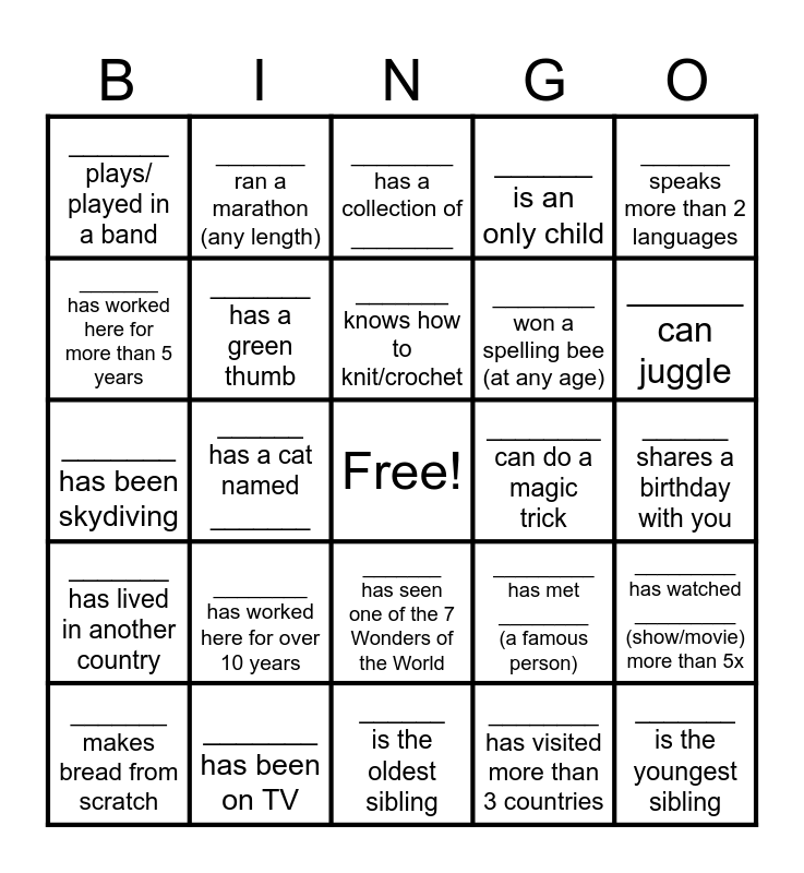This bingo card has a free space and 34 words: _______ has been on a cruise, ________ has visited more than 3 countries, _______ has a mini farm, _____ loves to hike, _______ has lived in another country, _______ has a green thumb, _______ speaks more than 2 languages, _______ makes bread from scratch, _______ ran a marathon (any length), _______ can play an instrument, _______ knows how to knit/crochet, ________ has a collection of ________, _______ is a book worm, ______ plays a sport, ________ can do a magic trick, ______ can juggle, _______ has been on TV, _______ has been skydiving, ________ has worked here for over 10 years, _________ has met ________ (a famous person), _______ has seen one of the 7 Wonders of the World, _______ has broken a bone, _______ plays/ played in a band, ______ shares a birthday with you, ______ is the oldest sibling, _______ is the youngest sibling, ______ is an only child, __________ played a sport in high school/college, ________ won a spelling bee (at any age), _______ has worked here for more than 5 years, ______ has a dog named ______, ______ has a cat named _______, _________ has watched _________ (show/movie) more than 5x and _______ likes pineapple on pizza.