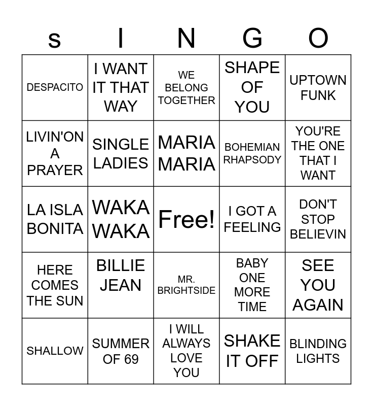 This bingo card has a free space and 50 words: HELLO, BLINDING LIGHTS, TAKE ON ME, I WILL ALWAYS LOVE YOU, BILLIE JEAN, BARBIE GIRL, I WANT IT THAT WAY, GIRLS JUST WANT TO HAVE FUN, LIVIN'ON A PRAYER, ALL I WANT FOR CHRISTMAS, SINGLE LADIES, SHAPE OF YOU, SEE YOU AGAIN, BABY ONE MORE TIME, DANCING QUEEN, CALIFORNIA GURLS, MARIA MARIA, I GOT A FEELING, HEY YA, UPTOWN FUNK, WAKA WAKA, SHAKE IT OFF, DESPACITO, BOHEMIAN RHAPSODY, PARTY IN THE USA, BELIEVER, YOU'RE THE ONE THAT I WANT, WANNEBE, WE BELONG TOGETHER, MR. BRIGHTSIDE, (EVERYTHING I DO)DO IT FOR YOU, ALL STAR, WONDER WALL, MACARENA, SUMMER OF 69, WHAT IS LOVE, HOLLABACK, LOSE YOURSELF, PIANO MAN, DON'T STOP BELIEVIN, HIJO DE LA LUNA, MY HEART WILL GO ON, CHEAP THRILLS, SWEET CHILD OF MINE, SHALLOW, LA ISLA BONITA, SMELLS LIKE TEEN SPIRIT, AFRICA, HERE COMES THE SUN and ROCKET MAN.