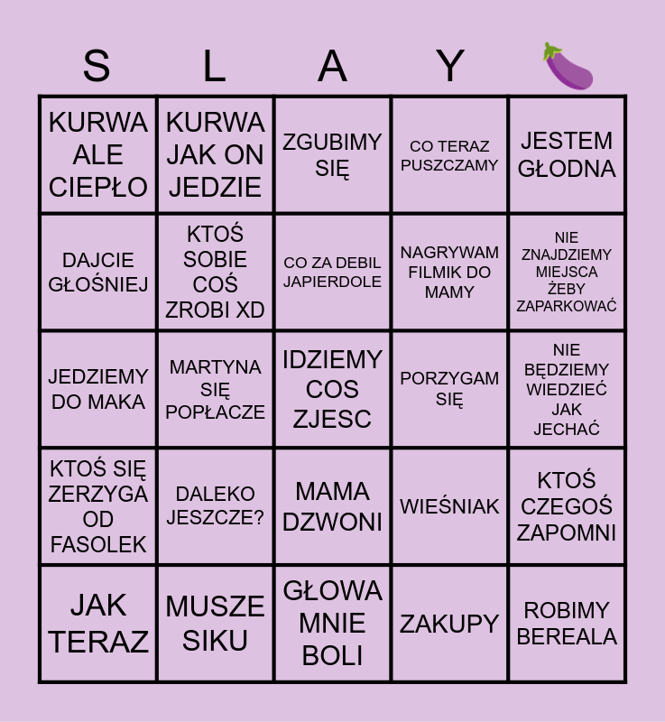 This bingo card has a free space and 24 words: DALEKO JESZCZE?, MUSZE SIKU, CO ZA DEBIL JAPIERDOLE, JAK TERAZ, JESTEM GŁODNA, KURWA ALE CIEPŁO, DAJCIE GŁOŚNIEJ, KURWA JAK ON JEDZIE, PORZYGAM SIĘ, MAMA DZWONI, NAGRYWAM FILMIK DO MAMY, JEDZIEMY DO MAKA, WIEŚNIAK, KTOŚ CZEGOŚ ZAPOMNI, KTOŚ SOBIE COŚ ZROBI XD, ZAKUPY, NIE BĘDZIEMY WIEDZIEĆ JAK JECHAĆ, ZGUBIMY SIĘ, NIE ZNAJDZIEMY MIEJSCA ŻEBY ZAPARKOWAĆ, MARTYNA SIĘ POPŁACZE, ROBIMY BEREALA, KTOŚ SIĘ ZERZYGA OD FASOLEK, CO TERAZ PUSZCZAMY and GŁOWA MNIE BOLI.