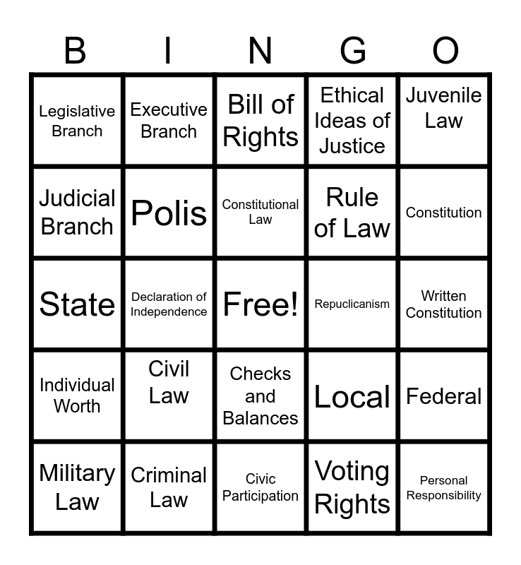 This bingo card has a free space and 24 words: Civil Law, Criminal Law, Constitutional Law, Military Law, Juvenile Law, Legislative Branch, Judicial Branch, Executive Branch, Repuclicanism, Checks and Balances, Rule of Law, State, Local, Federal, Polis, Voting Rights, Written Constitution, Bill of Rights, Constitution, Declaration of Independence, Personal Responsibility, Individual Worth, Ethical Ideas of Justice and Civic Participation.