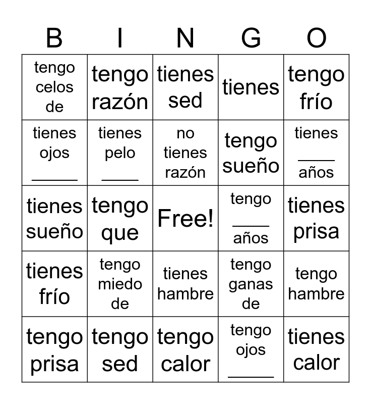 This bingo card has a free space and 24 words: tengo miedo de, tengo sed, no tienes razón, tengo prisa, tengo frío, tengo celos de, tienes ojos _____, tengo razón, tengo ____ años, tienes hambre, tengo sueño, tienes sueño, tengo ganas de, tengo hambre, tienes pelo ____, tengo ojos _____, tienes prisa, tienes sed, tienes ____ años, tengo que, tienes calor, tienes frío, tienes and tengo calor.
