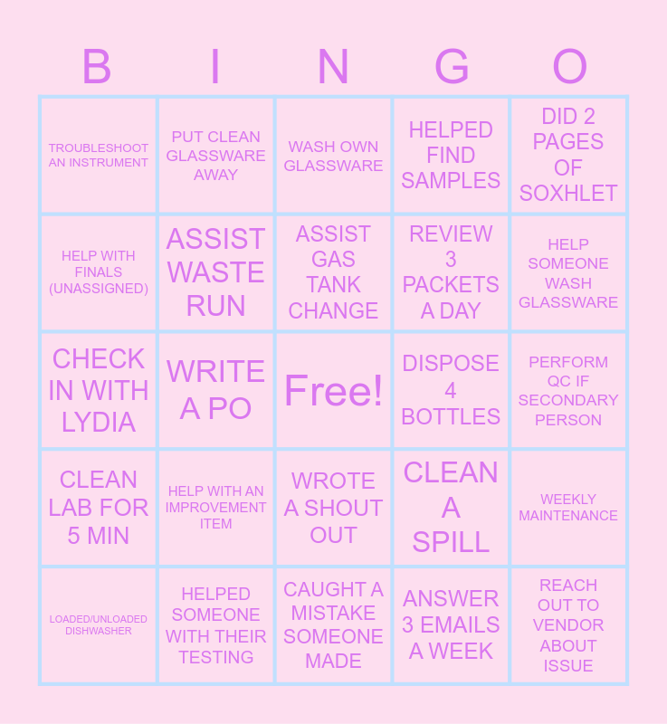 This bingo card has a free space and 28 words: WEEKLY MAINTENANCE, INVENTORY RESTOCK, REVIEW 3 PACKETS A DAY, ANSWER 3 EMAILS A WEEK, HELP WITH FINALS (UNASSIGNED), WASH OWN GLASSWARE, PUT CLEAN GLASSWARE AWAY, CLEAN LAB FOR 5 MIN, DISPOSE 4 BOTTLES, LOADED/UNLOADED DISHWASHER, CHECK IN WITH LYDIA, HELPED FIND SAMPLES, HELPED SOMEONE WITH THEIR TESTING, CAUGHT A MISTAKE SOMEONE MADE, HELP SOMEONE WASH GLASSWARE, DID SAMPLE RETESTS, HELP WITH AN IMPROVEMENT ITEM, ASSIST WASTE RUN, ASSIST GAS TANK CHANGE, WROTE A SHOUT OUT, TROUBLESHOOT AN INSTRUMENT, HELP WATER ACTIVITY, REACH OUT TO VENDOR ABOUT ISSUE, WRITE A PO, PERFORM QC IF SECONDARY PERSON, CLEAN A SPILL, DID 2 PAGES OF SOXHLET and CAUGHT MISSING INITIALS ON MASTERLIST.