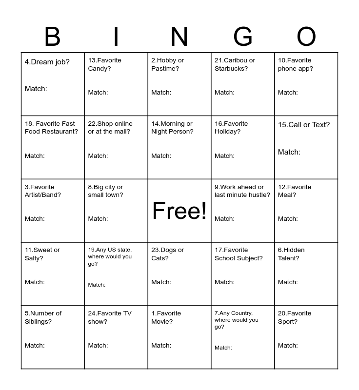 This bingo card has a free space and 24 words: 19.Any US state, where would you go? Match:, 24.Favorite TV show? Match:, 14.Morning or Night Person? Match:, 5.Number of Siblings? Match:, 10.Favorite phone app? Match:, 4.Dream job? Match:, 18. Favorite Fast Food Restaurant? Match:, 13.Favorite Candy? Match:, 9.Work ahead or last minute hustle? Match:, 23.Dogs or Cats? Match:, 16.Favorite Holiday? Match:, 3.Favorite Artist/Band? Match:, 17.Favorite School Subject? Match:, 6.Hidden Talent? Match:, 22.Shop online or at the mall? Match:, 7.Any Country, where would you go? Match:, 12.Favorite Meal? Match:, 2.Hobby or Pastime? Match:, 15.Call or Text? Match:, 8.Big city or small town? Match:, 20.Favorite Sport? Match:, 11.Sweet or Salty? Match:, 21.Caribou or Starbucks? Match: and 1.Favorite Movie? Match:.