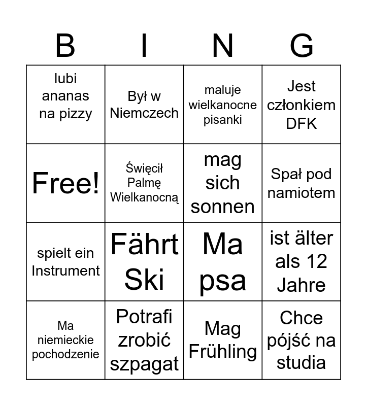 This bingo card has 16 words: Potrafi zrobić szpagat, ist älter als 12 Jahre, maluje wielkanocne pisanki, lubi ananas na pizzy, spielt ein Instrument, Był w Niemczech, Ma psa, Mag Frühling, Free!, Święcił Palmę Wielkanocną, Ma niemieckie pochodzenie, Jest członkiem DFK, Fährt Ski, Spał pod namiotem, mag sich sonnen and Chce pójść na studia.