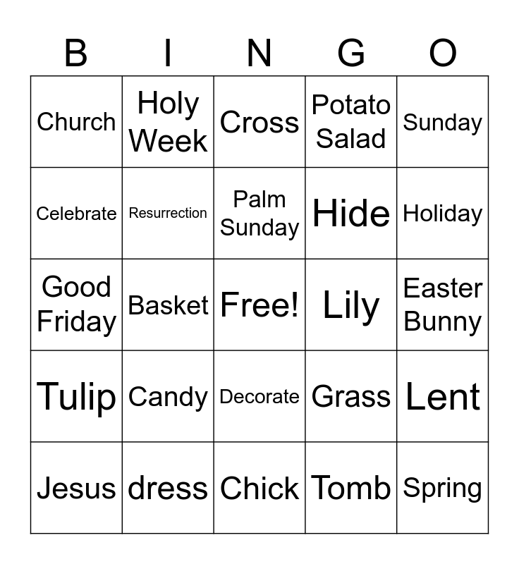 This bingo card has a free space and 29 words: Jesus, Egg, Basket, Chocolate, Church, Cross, Resurrection, Candy, Lily, dress, Easter Bunny, Spring, Chick, Tomb, Holiday, Lamb, Decorate, Tulip, Sunday, Good Friday, Grass, Hunt, Hide, Celebrate, Potato Salad, Holy Week, Lent, Palm Sunday and Risen.