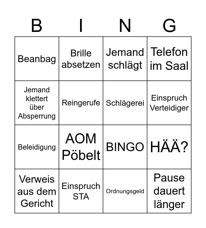 This bingo card has 16 words: Einspruch STA, HÄÄ?, Jemand schlägt, Beanbag, Beleidigung, Brille absetzen, BINGO, Ordnungsgeld, Jemand klettert über Absperrung, Reingerufe, Verweis aus dem Gericht, Telefon im Saal, AOM Pöbelt, Einspruch Verteidiger, Schlägerei and Pause dauert länger.