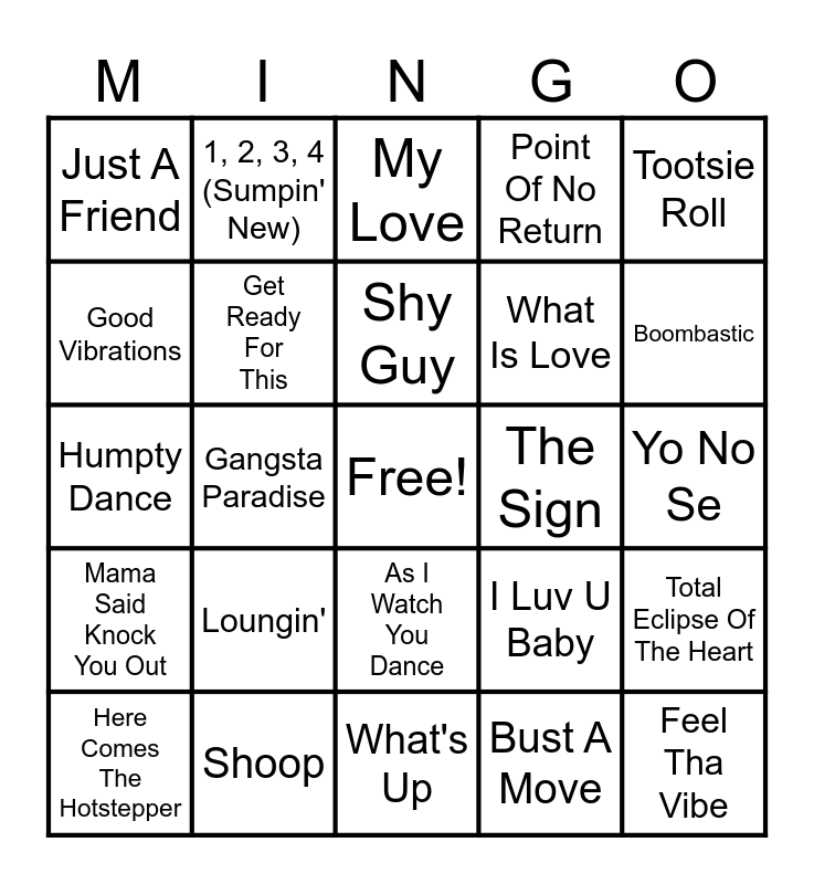 This bingo card has a free space and 35 words: Rhythm Is A Dancer, Your Loving Arms, This Is Your Night, Get Ready For This, As I Watch You Dance, Point Of No Return, Good Vibrations, Nu Nu, Shy Guy, One By One, Humpty Dance, Tootsie Roll, Don't Walk Away, I'll Be Around, Just A Friend, The Sign, Bust A Move, Gangsta Paradise, Mama Said Knock You Out, Feel Tha Vibe, I Luv U Baby, Here Comes The Hotstepper, Total Eclipse Of The Heart, Shoop, My Love, Boombastic, Shamrocks And Shenanigans, America (I Love America), What Is Love, Yo No Se, Killing Me Softly, What's Up, Loungin', 1, 2, 3, 4 (Sumpin' New) and Don't Give Me Your Life.