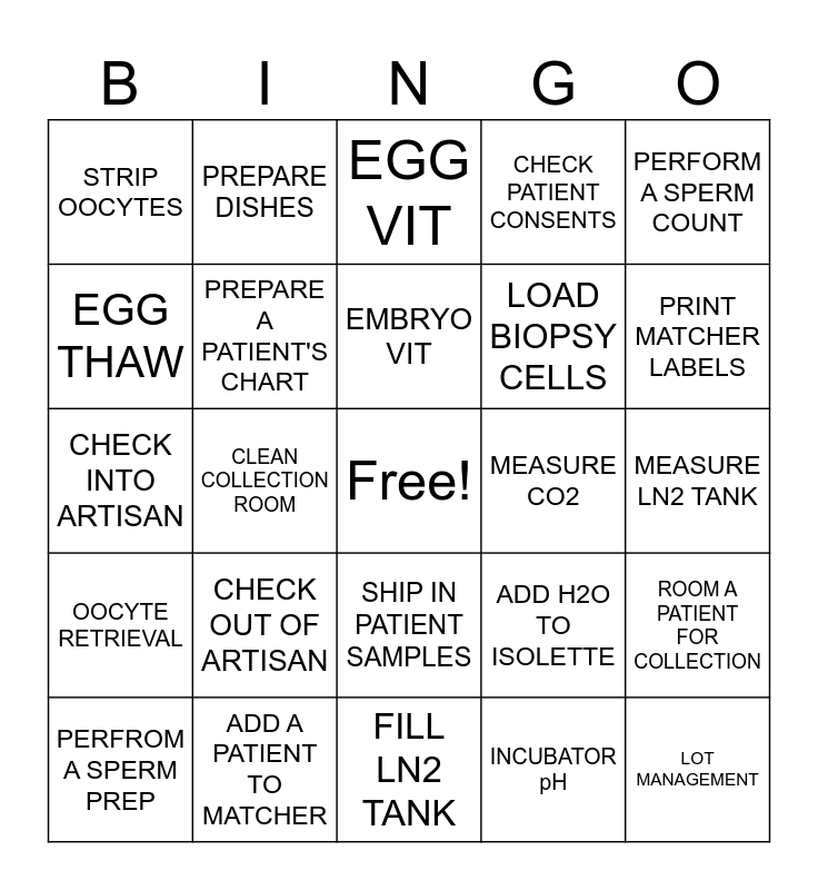 This bingo card has a free space and 34 words: RESTOCK SUPPLIES, INCUBATOR pH, EMBRYO BIOPSY, ICSI, OOCYTE RETRIEVAL, PREPARE A PATIENT'S CHART, PERFORM A SPERM COUNT, PERFROM A SPERM PREP, PREPARE DISHES, SPEAK TO PATIENT ABOUT RESULTS, EMBRYO VIT, EGG VIT, EMBRYO TRANSFER, FERTILIZATION CHECK, MEASURE CO2, PRINT MATCHER LABELS, ADD A PATIENT TO MATCHER, CHECK INTO ARTISAN, CHECK OUT OF ARTISAN, ADD H2O TO ISOLETTE, SHIP IN PATIENT SAMPLES, SHIP OUT PATIENT SAMPLES, STRIP OOCYTES, MEASURE LN2 TANK, FILL LN2 TANK, LOT MANAGEMENT, CHECK PATIENT CONSENTS, GRADE AN EMBRYO, LOAD BIOPSY CELLS, EGG THAW, EMBRYO THAW, CLEAN COLLECTION ROOM, ROOM A PATIENT FOR COLLECTION and PICK UP A SAMPLE FROM PATIENT.