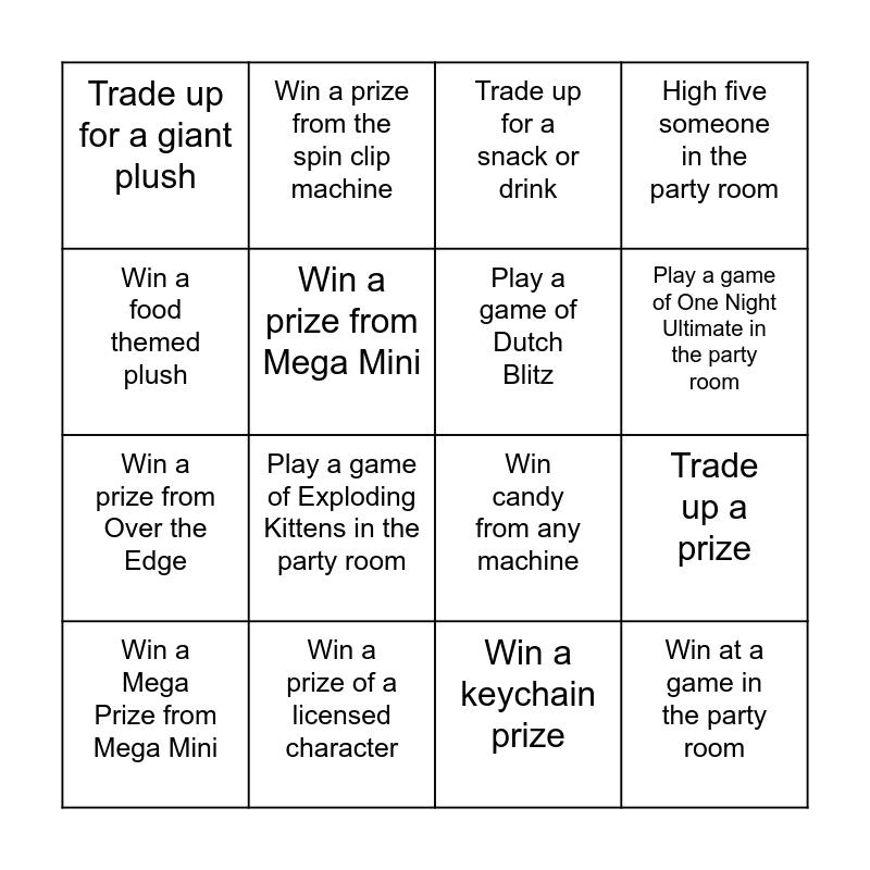 This bingo card has 16 words: Win a prize of a licensed character, Trade up a prize, Trade up for a snack or drink, Trade up for a giant plush, Win a prize from Over the Edge, Win a prize from the spin clip machine, Win candy from any machine, Win a keychain prize, Win a food themed plush, Win a prize from Mega Mini, Win a Mega Prize from Mega Mini, High five someone in the party room, Play a game of Exploding Kittens in the party room, Play a game of One Night Ultimate in the party room, Play a game of Dutch Blitz and Win at a game in the party room.