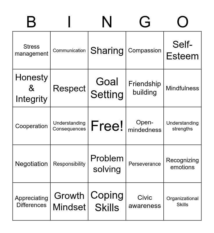 This bingo card has a free space and 24 words: Responsibility, Growth Mindset, Goal Setting, Appreciating Differences, Self-Esteem, Stress management, Honesty & Integrity, Communication, Open-mindedness, Problem solving, Friendship building, Cooperation, Perseverance, Recognizing emotions, Respect, Civic awareness, Understanding strengths, Sharing, Mindfulness, Understanding Consequences, Organizational Skills, Negotiation, Compassion and Coping Skills.