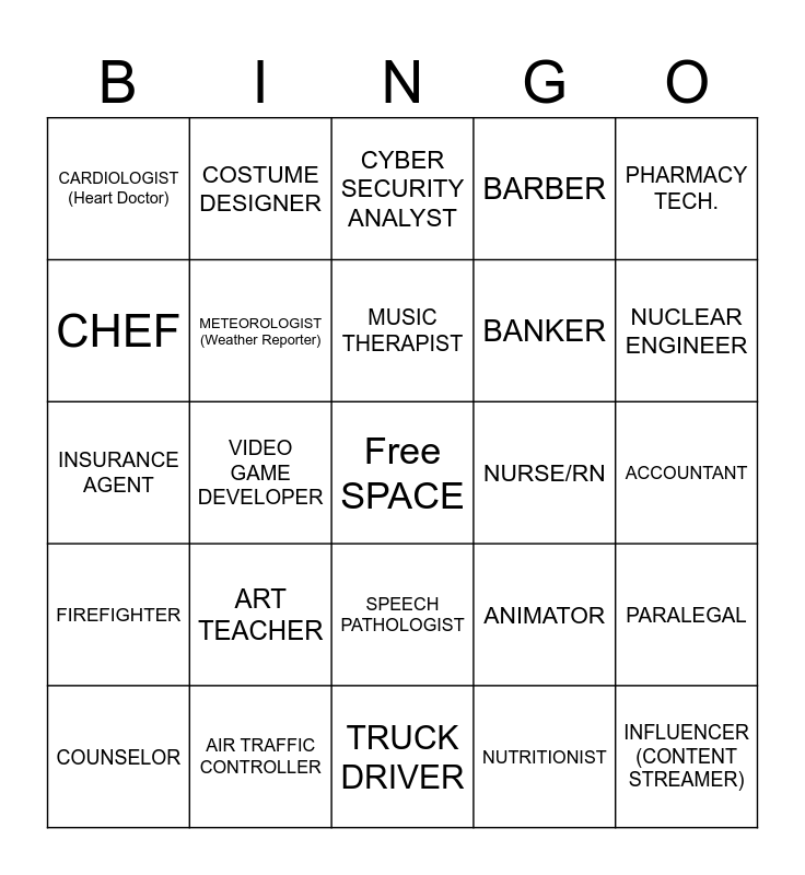 This bingo card has a free space and 24 words: ART TEACHER, AIR TRAFFIC CONTROLLER, MUSIC THERAPIST, COUNSELOR, PHARMACY TECH., CARDIOLOGIST (Heart Doctor), CHEF, COSTUME DESIGNER, NURSE/RN, SPEECH PATHOLOGIST, BANKER, INSURANCE AGENT, ANIMATOR, PARALEGAL, METEOROLOGIST (Weather Reporter), NUTRITIONIST, ACCOUNTANT, CYBER SECURITY ANALYST, NUCLEAR ENGINEER, VIDEO GAME DEVELOPER, INFLUENCER (CONTENT STREAMER), FIREFIGHTER, BARBER and TRUCK DRIVER.
