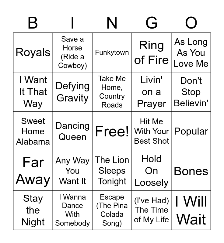 This bingo card has a free space and 106 words: Last Friday Night (T.G.I.F.), California Gurls, As Long As You Love Me, Ignition, Last Night, Just the Way You Are, Super Bass, The Real Slim Shady, Drop It Like It's Hot, In Da Club, Ain't No Mountain High Enough, Year 3000, Take On Me, Everybody (Backstreet's Back), Come Sail Away, Are You Gonna Be My Girl, Funkytown, Should I Stay or Should I Go, Seven Nation Army, Single Ladies, The Lion Sleeps Tonight, No Scrubs, Shout, Pts. 1 & 2, You Are the One That I Want, We Are the Champions, Any Way You Want It, Don't Stop Believin', Ring of Fire, Mambo No. 5, Believe, Hold On Loosely, (I've Had) The Time of My Life, Who Are You, Sugar, Sugar, Say My Name, Don't Worry Be Happy, Who Let The Dogs Out, Rolling in the Deep, Take Me Home, Country Roads, Take A Chance On Me, Mamma Mia, Heaven is a Place On Earth, Jolene, Far Away, Iris, I Want It That Way, Zombie, Royals, All Summer Long, I Will Wait, Islands in the Stream, I Wanna Dance With Somebody, Use Somebody, Ho Hey, I Want You Back, Baby, Y.M.C.A., Love Story (Taylor's Version), Before He Cheats, Save a Horse (Ride a Cowboy), The Gambler, With Arms Wide Open, Walking on Sunshine, Sweet Caroline, Africa, Summer of '69, American Pie, Hooked on a Feeling, Livin' on a Prayer, Sweet Home Alabama, Dancing Queen, Escape (The Pina Colada Song), Girls Just Want To Have Fun, Raise Your Glass, You Give Love a Bad Name, Man! I Feel Like a Woman, Wannabe, Sweet Child O'Mine, We Built This City, Summer Nights, Kokomo, Here Comes the Sun, Ice Ice Baby, Hound Dog, Livin' La Vida Loca, Tiny Dancer, Hit Me With Your Best Shot, Surfin U.S.A, I'm Still Standing, Gimme! Gimme! Gimme!, Mr. Blue Sky, This Love, Replay, Believer, Dynamite, Bones, Feel This Moment, Lovin On Me, Pepas, Popular, Defying Gravity, HOT TO GO!, Pumped Up Kicks, Can't Hold Us, Stay the Night and Starships.