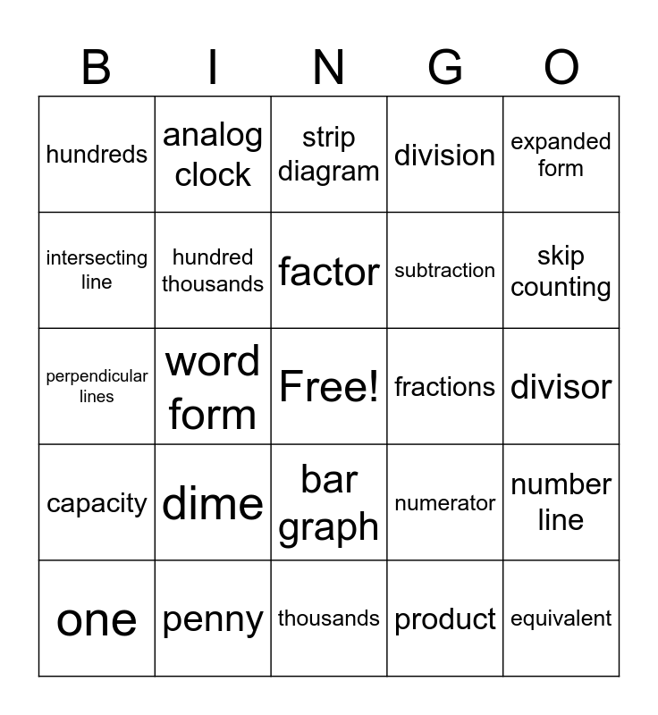 This bingo card has a free space and 55 words: place value, one, ten, hundreds, thousands, ten thousands, hundred thousands, addition, subtraction, multiplication, division, greater than, less than, odd, even, rounding, expanded form, word form, standard form, equivalent, fractions, denominator, numerator, strip diagram, unit fraction, factor, product, quotient, divisor, number line, area, perimeter, polygon, parallel lines, intersecting line, perpendicular lines, weight, capacity, time, money, analog clock, digital clock, quarter, nickel, dime, penny, bill, hour, minute, skip counting, repeated addition, repeated subtraction, dot plot, bar graph and pictograph.