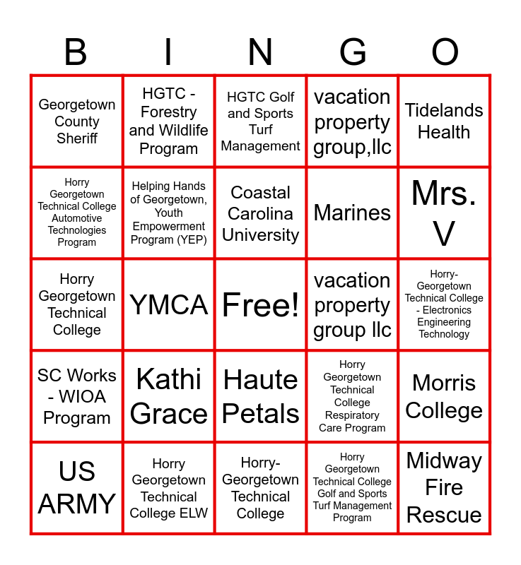This bingo card has a free space and 27 words: Georgetown County Department of Public Services- Stormwater and Mosquito Control Division, Horry Georgetown Technical College ELW, Coastal Carolina University, Horry Georgetown Technical College Golf and Sports Turf Management Program, Tidelands Health, Horry Georgetown Technical College Automotive Technologies Program, HGTC - Forestry and Wildlife Program, Horry-Georgetown Technical College, vacation property group llc, Morris College, SC Works - WIOA Program, Helping Hands of Georgetown, Youth Empowerment Program (YEP), Horry Georgetown Technical College Respiratory Care Program, Midway Fire Rescue, Horry Georgetown Technical College, HTC (Horry Telephone Cooperative, Inc.), HGTC Golf and Sports Turf Management, vacation property group,llc, Horry-Georgetown Technical College - Electronics Engineering Technology, Georgetown County Sheriff, Kathi Grace, Haute Petals, Marines, Mrs. V, US ARMY, YMCA and Texas Roadhouse.