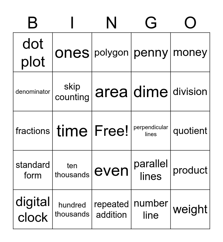 This bingo card has a free space and 55 words: Pictograph, digital clock, bar graph, dot plot, repeated addition, repeated subtraction, skip counting, quarter, dime, nickel, penny, bill, hour, minute, expanded form, analog clock, money, time, capacity, weight, perpendicular lines, intersecting lines, parallel lines, polygon, perimeter, area, number line, divisor, quotient, product, factor, unit fraction, strip diagram, numerator, denominator, fractions, equivalent, standard form, word form, place value, ones, ten, hundreds, thousands, ten thousands, hundred thousands, addition, subtraction, multiplication, division, greater than, less than, odd, even and rounding.
