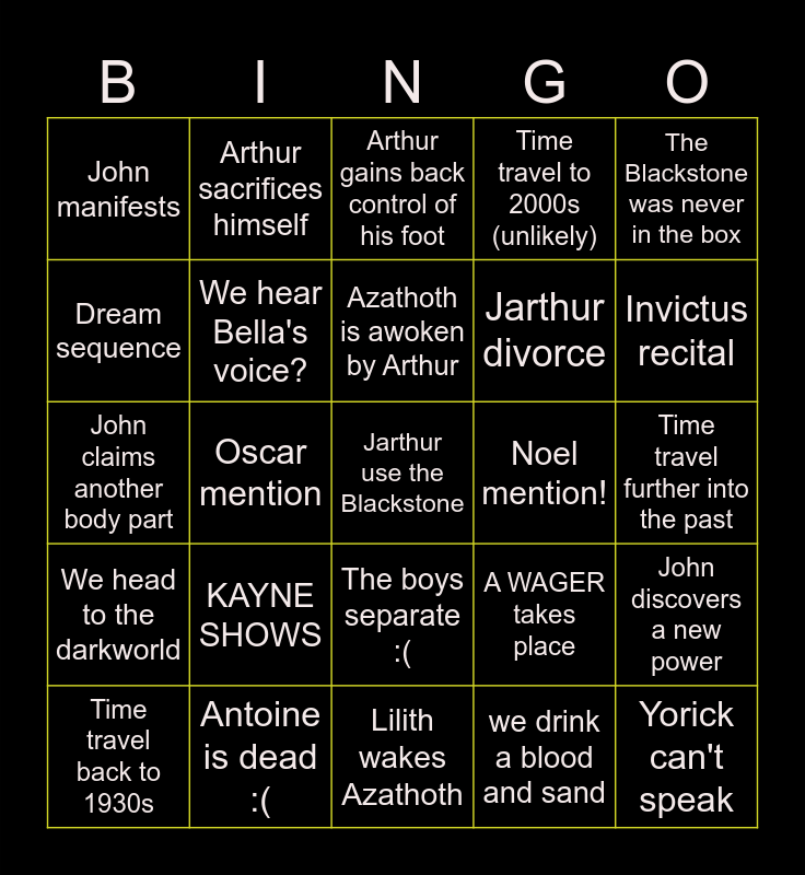 This bingo card has 25 words: KAYNE SHOWS, Lilith wakes Azathoth, Azathoth is awoken by Arthur, Time travel back to 1930s, The Blackstone was never in the box, John manifests, Dream sequence, Arthur sacrifices himself, Noel mention!, The boys separate :(, Jarthur divorce, John claims another body part, A WAGER takes place, John discovers a new power, We hear Bella's voice?, Yorick can't speak, Time travel further into the past, Arthur gains back control of his foot, Invictus recital, Oscar mention, Jarthur use the Blackstone, Antoine is dead :(, We head to the darkworld, Time travel to 2000s (unlikely) and we drink a blood and sand.