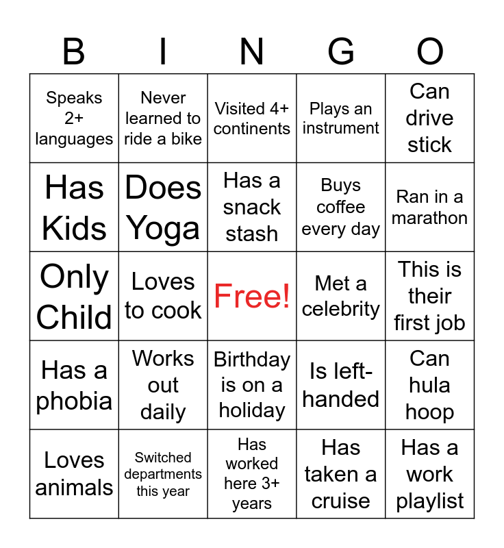 This bingo card has a free space and 24 words: Works out daily, Switched departments this year, Has a snack stash, Loves animals, Can drive stick, Speaks 2+ languages, Has Kids, Never learned to ride a bike, Met a celebrity, Birthday is on a holiday, Buys coffee every day, Only Child, Is left-handed, Can hula hoop, Does Yoga, Has taken a cruise, This is their first job, Visited 4+ continents, Ran in a marathon, Loves to cook, Has a work playlist, Has a phobia, Plays an instrument and Has worked here 3+ years.
