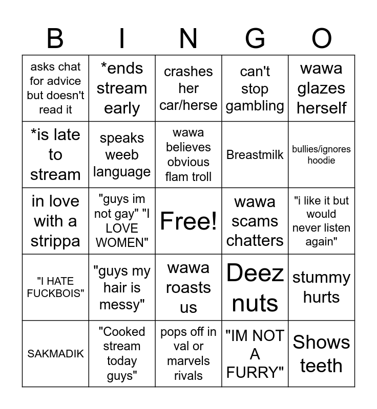 This bingo card has a free space and 24 words: "guys my hair is messy", "Cooked stream today guys", wawa believes obvious flam troll, SAKMADIK, wawa glazes herself, asks chat for advice but doesn't read it, *is late to stream, *ends stream early, wawa scams chatters, wawa roasts us, Breastmilk, in love with a strippa, Deez nuts, stummy hurts, speaks weeb language, "IM NOT A FURRY", "i like it but would never listen again", crashes her car/herse, bullies/ignores hoodie, "guys im not gay" "I LOVE WOMEN", Shows teeth, "I HATE FUCKBOIS", can't stop gambling and pops off in val or marvels rivals.