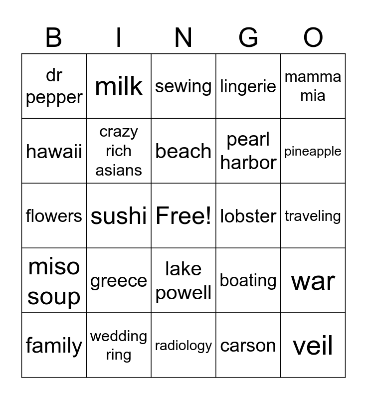This bingo card has a free space and 32 words: carson, crochet, sushi, sun, miso soup, crazy rich asians, mamma mia, war, milk, shots, beach, sewing, tennis, shrimp, lobster, crab, family, flowers, lake powell, greece, boating, las vegas, traveling, wedding ring, veil, lingerie, pearl harbor, hawaii, dr pepper, radiology, rainbow loom bands and pineapple.