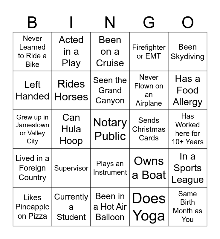 This bingo card has 53 words: Free!, Notary Public, Knows how to Surf, Does Yoga, Supervisor, Spelling Bee Winner, Acted in a Play, Won a Contest, Left Handed, Gardens, Rides Horses, Has Broken a Bone, In a Sports League, Owns a Boat, Knows ASL, Likes Pineapple on Pizza, Seen the Grand Canyon, Sends Christmas Cards, Likes Escape Rooms, Been Skydiving, Can Hula Hoop, Same Birth Month as You, Never Flown on an Airplane, Never Learned to Ride a Bike, Collects Something, Currently a Student, Listens to Podcasts, Attended a High School Reunion, Travels Often, Has a Food Allergy, Got Help From a Stranger, Visited 3+ Countries, Speaks 2+ Languages, Owns/Invests in Cryptocurrency, Climbed a Mountain, Can Drive Stick Shift, Firefighter or EMT, Been in a Hot Air Balloon, Been on a Cruise, Ran a Marathon, Watches Documentaries, Has a Snack Stash, Has Worked here for 10+ Years, Has a Favorite Pen/Pencil, Works Out, Plays an Instrument, Read 10+ Books this Year, Has a Pet, Grew up in Jamestown or Valley City, Lived in a Foreign Country, Has a Messy Desk, Can Crochet and Knows Calligraphy.