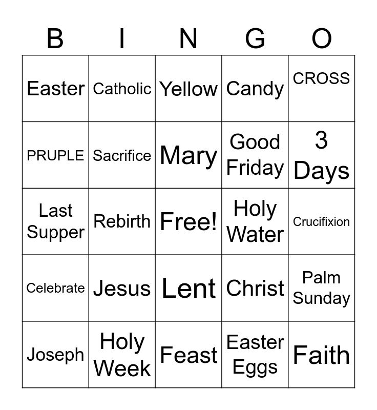 This bingo card has a free space and 24 words: Jesus, Holy Week, Mary, Joseph, CROSS, Easter, PRUPLE, Catholic, Holy Water, Lent, Good Friday, Last Supper, Christ, Palm Sunday, Sacrifice, Easter Eggs, Crucifixion, Yellow, 3 Days, Rebirth, Faith, Celebrate, Candy and Feast.