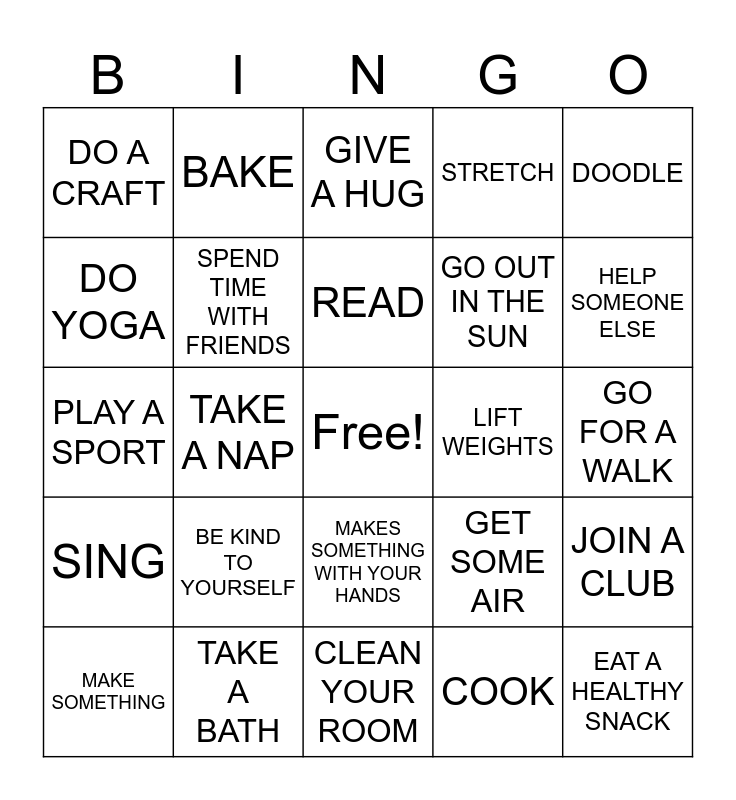 This bingo card has a free space and 37 words: ASK FOR HELP, WATCH A FUNNY VIDEO, LEARN SOMETHING NEW, SPEND TIME WITH FRIENDS, JOIN A CLUB, BE KIND TO YOURSELF, READ, WRITE IN A JOURNAL, DOODLE, MEDITATE, TAKE A NAP, STRETCH, EAT A HEALTHY SNACK, GO FOR A WALK, DO YOGA, SING, SPEND TIME WITH A PET, GIVE A HUG, MAKES SOMETHING WITH YOUR HANDS, LIFT WEIGHTS, DO A CRAFT, HELP SOMEONE ELSE, MAKE SOMETHING, CLEAN YOUR ROOM, ORGANIZE, COOK, BAKE, SPEND TIME OUTSIDE, DANCE, DRAW, DO SOMETHING NICE FOR SOMEONE, TAKE A BATH, PLAY A SPORT, PLAY MUSIC, GET SOME AIR, GO OUT IN THE SUN and HAVE A BELLY LAUGH.