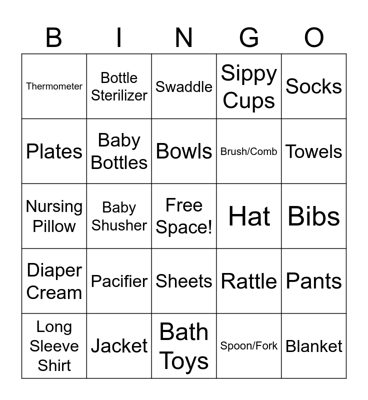 This bingo card has a free space and 29 words: Long Sleeve Shirt, Tummy Time Water Mat, Baby Shusher, Pilot Themed Shirt, Thermometer, Swaddle, Baby Bottles, Pacifier, Hat, Jacket, Bibs, Blanket, Bath Toys, Spoon/Fork, Towels, Tushbaby, Sheets, Diaper Cream, Socks, Nursing Pillow, Rattle, Book, Brush/Comb, Plates, Sippy Cups, Bottle Sterilizer, Pants, Bowls and Lotion.