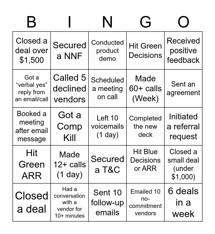 This bingo card has 25 words: Made 12+ calls (1 day), Sent 10 follow-up emails, Scheduled a meeting on call, Closed a deal, Received positive feedback, Closed a deal over $1,500, Got a “verbal yes” reply from an email/call, Secured a NNF, Completed the new deck, Secured a T&C, Made 60+ calls (Week), Booked a meeting after email message, Hit Blue Decisions or ARR, Closed a small deal (under $1,000), Called 5 declined vendors, 6 deals in a week, Initiated a referral request, Conducted product demo, Sent an agreement, Got a Comp Kill, Left 10 voicemails (1 day), Had a conversation with a vendor for 10+ minutes, Hit Green ARR, Hit Green Decisions and Emailed 10 no-commitment vendors.