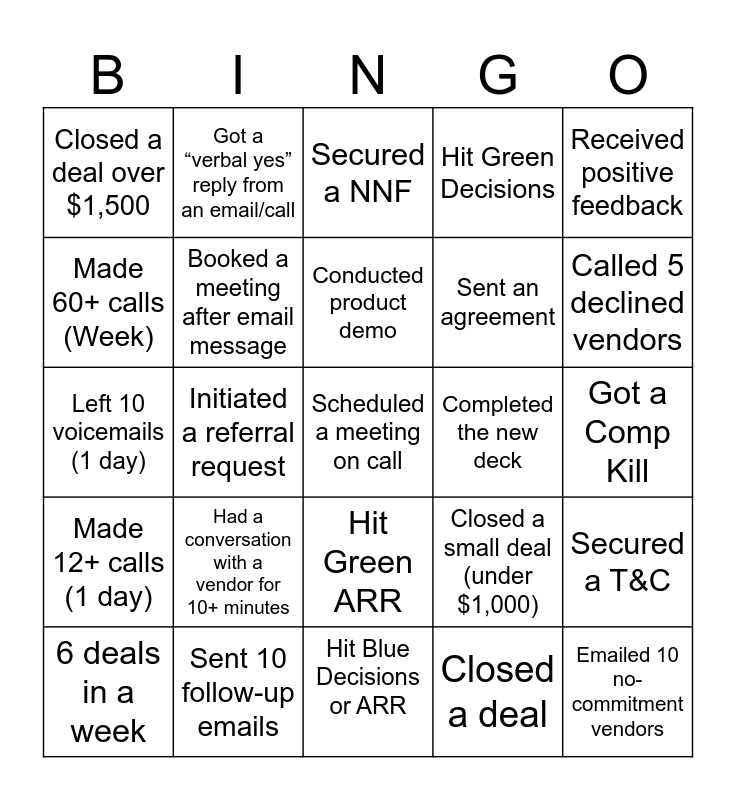 This bingo card has 25 words: Made 12+ calls (1 day), Sent 10 follow-up emails, Scheduled a meeting on call, Closed a deal, Received positive feedback, Closed a deal over $1,500, Got a “verbal yes” reply from an email/call, Secured a NNF, Completed the new deck, Secured a T&C, Made 60+ calls (Week), Booked a meeting after email message, Hit Blue Decisions or ARR, Closed a small deal (under $1,000), Called 5 declined vendors, 6 deals in a week, Initiated a referral request, Conducted product demo, Sent an agreement, Got a Comp Kill, Left 10 voicemails (1 day), Had a conversation with a vendor for 10+ minutes, Hit Green ARR, Hit Green Decisions and Emailed 10 no-commitment vendors.
