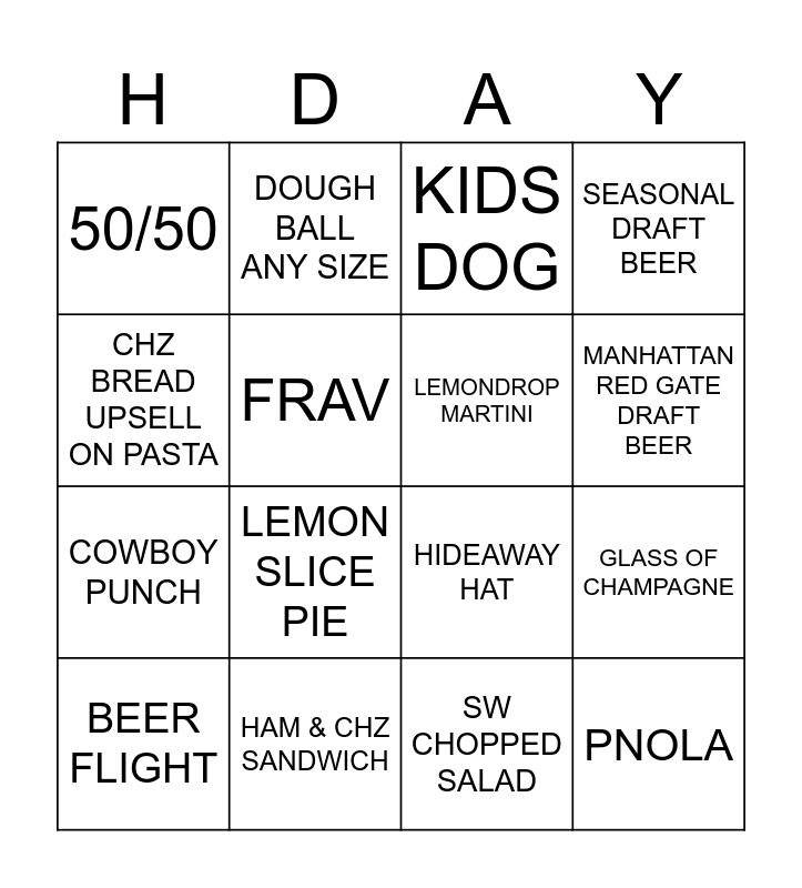 This bingo card has 16 words: HAM & CHZ SANDWICH, GLASS OF CHAMPAGNE, KIDS DOG, 50/50, COWBOY PUNCH, DOUGH BALL ANY SIZE, HIDEAWAY HAT, SW CHOPPED SALAD, CHZ BREAD UPSELL ON PASTA, FRAV, BEER FLIGHT, SEASONAL DRAFT BEER, LEMON SLICE PIE, MANHATTAN RED GATE DRAFT BEER, LEMONDROP MARTINI and PNOLA.