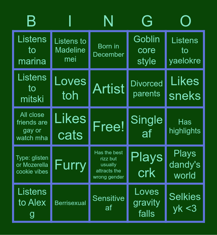 This bingo card has a free space and 24 words: Furry, Berrisexual, Artist, Listens to Alex g, Listens to yaelokre, Listens to marina, Listens to mitski, Listens to Madeline mei, Single af, Has the best rizz but usually attracts the wrong gender, Divorced parents, All close friends are gay or watch mha, Plays crk, Plays dandy's world, Loves toh, Loves gravity falls, Has highlights, Born in December, Likes sneks, Likes cats, Selkies yk <3, Type: glisten or Mozerella cookie vibes, Goblin core style and Sensitive af.