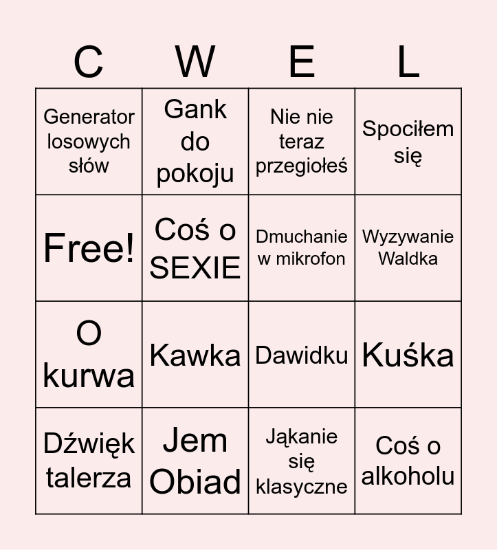This bingo card has 16 words: Jem Obiad, Kuśka, Nie nie teraz przegiołeś, Generator losowych słów, O kurwa, Gank do pokoju, Dawidku, Jąkanie się klasyczne, Free!, Coś o SEXIE, Dźwięk talerza, Spociłem się, Kawka, Wyzywanie Waldka, Dmuchanie w mikrofon and Coś o alkoholu.