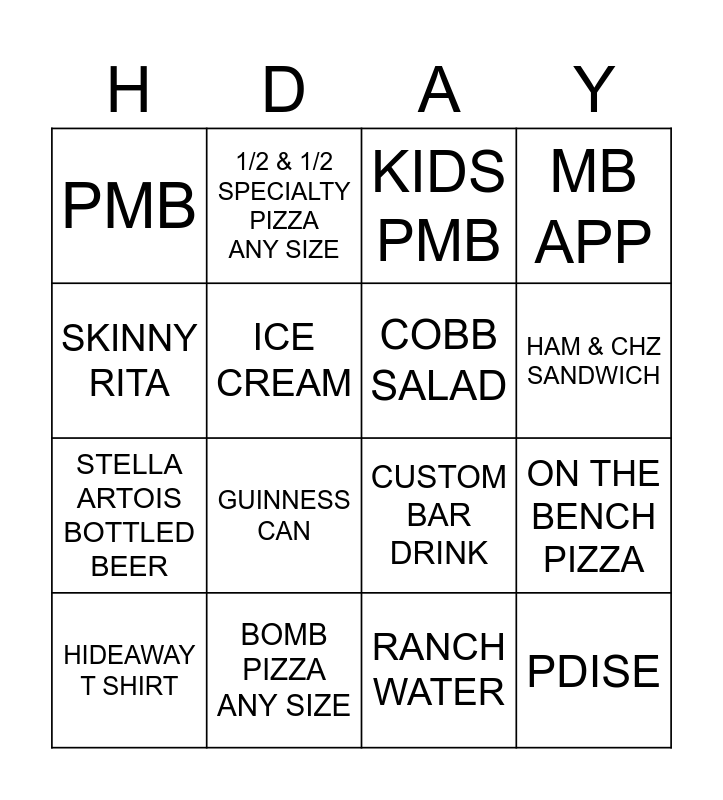 This bingo card has 16 words: BOMB PIZZA ANY SIZE, ON THE BENCH PIZZA, KIDS PMB, PMB, STELLA ARTOIS BOTTLED BEER, 1/2 & 1/2 SPECIALTY PIZZA ANY SIZE, CUSTOM BAR DRINK, RANCH WATER, SKINNY RITA, ICE CREAM, HIDEAWAY T SHIRT, MB APP, GUINNESS CAN, HAM & CHZ SANDWICH, COBB SALAD and PDISE.