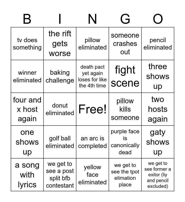 This bingo card has a free space and 24 words: golf ball eliminated, we get to see a post split bfb contestant, death pact yet again loses for like the 4th time, a song with lyrics, pencil eliminated, tv does something, winner eliminated, the rift gets worse, pillow kills someone, an arc is completed, fight scene, four and x host again, purple face is canonically dead, gaty shows up, baking challenge, we get to see the tpot elimation place, two hosts again, pillow eliminated, three shows up, donut eliminated, we get to see former a exitor (liy and pencil excluded), one shows up, someone crashes out and yellow face eliminated.