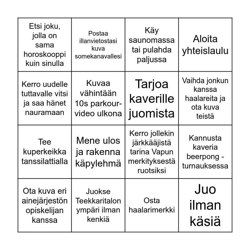 This bingo card has 16 words: Ota kuva eri ainejärjestön opiskelijan kanssa, Juokse Teekkaritalon ympäri ilman kenkiä, Käy saunomassa tai pulahda paljussa, Aloita yhteislaulu, Kerro uudelle tuttavalle vitsi ja saa hänet nauramaan, Postaa illanvietostasi kuva somekanavallesi, Kerro jollekin järkkääjistä tarina Vapun merkityksestä ruotsiksi, Kannusta kaveria beerpong -turnauksessa, Etsi joku, jolla on sama horoskooppi kuin sinulla, Kuvaa vähintään 10s parkour-video ulkona, Osta haalarimerkki, Vaihda jonkun kanssa haalareita ja ota kuva teistä, Tee kuperkeikka tanssilattialla, Mene ulos ja rakenna käpylehmä, Tarjoa kaverille juomista and Juo ilman käsiä.