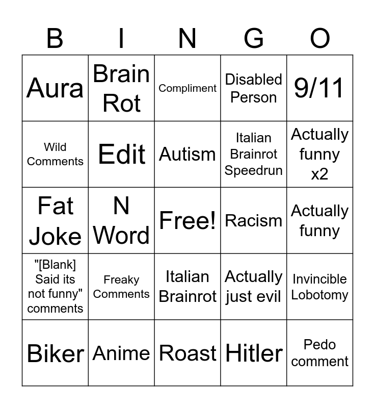 This bingo card has a free space and 24 words: Freaky Comments, Anime, Autism, Biker, 9/11, Aura, Wild Comments, Brain Rot, Racism, Italian Brainrot, Italian Brainrot Speedrun, Fat Joke, Actually just evil, Invincible Lobotomy, Edit, Hitler, Actually funny, Compliment, Actually funny x2, N Word, Pedo comment, "[Blank] Said its not funny" comments, Disabled Person and Roast.