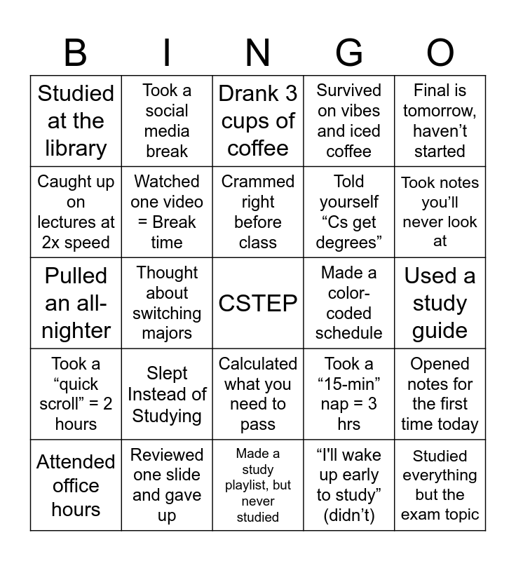 This bingo card has a free space and 24 words: Attended office hours, Slept Instead of Studying, Crammed right before class, “I'll wake up early to study” (didn’t), Final is tomorrow, haven’t started, Studied at the library, Took a social media break, Drank 3 cups of coffee, Made a color-coded schedule, Used a study guide, Pulled an all-nighter, Watched one video = Break time, Took a “15-min” nap = 3 hrs, Opened notes for the first time today, Caught up on lectures at 2x speed, Reviewed one slide and gave up, Made a study playlist, but never studied, Survived on vibes and iced coffee, Took notes you’ll never look at, Took a “quick scroll” = 2 hours, Thought about switching majors, Calculated what you need to pass, Told yourself “Cs get degrees” and Studied everything but the exam topic.
