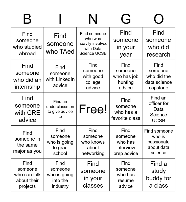 This bingo card has a free space and 24 words: Find someone who is going to grad school, Find someone who is going into the industry, Find someone with good college advice, Find someone who can talk about their projects, Find someone who did research, Find someone who studied abroad, Find someone who did an internship, Find someone who TAed, Find someone who has a favorite class, Find someone who knows about networking, Find someone who has job hunting advice, Find someone with GRE advice, Find someone who has interview prep advice, Find someone who is passionate about data science, Find someone with LinkedIn advice, Find someone who has resume advice, Find an officer for Data Science UCSB, Find someone who was heavily involved with Data Science UCSB, Find someone who did the data science capstone, Find an underclassmen to give advice to, Find a study buddy for a class, Find someone in the same major as you, Find someone in your year and Find someone in your classes.